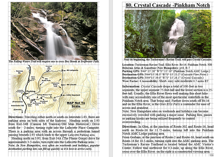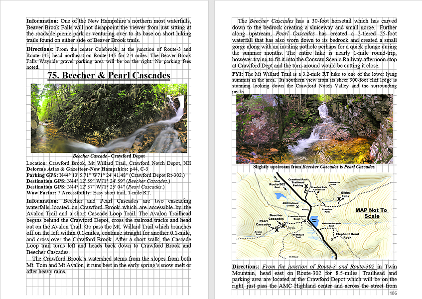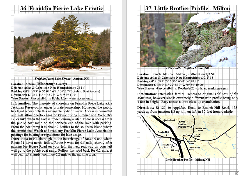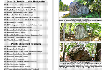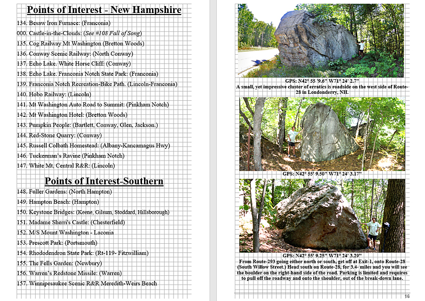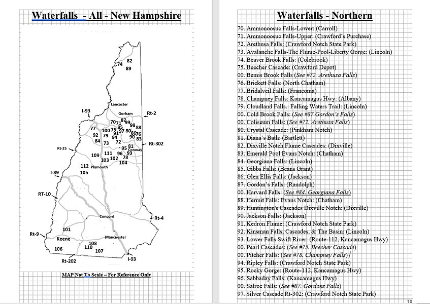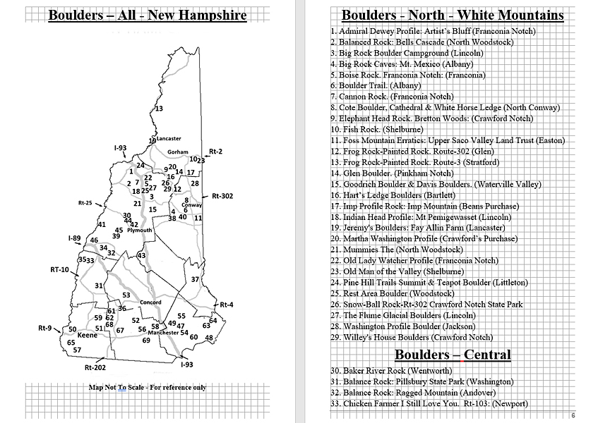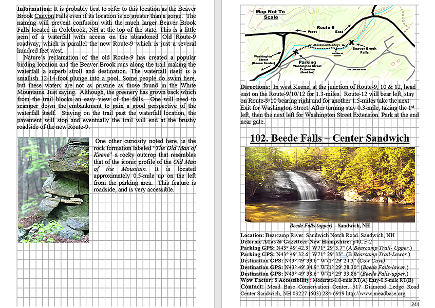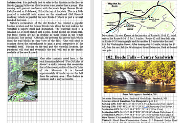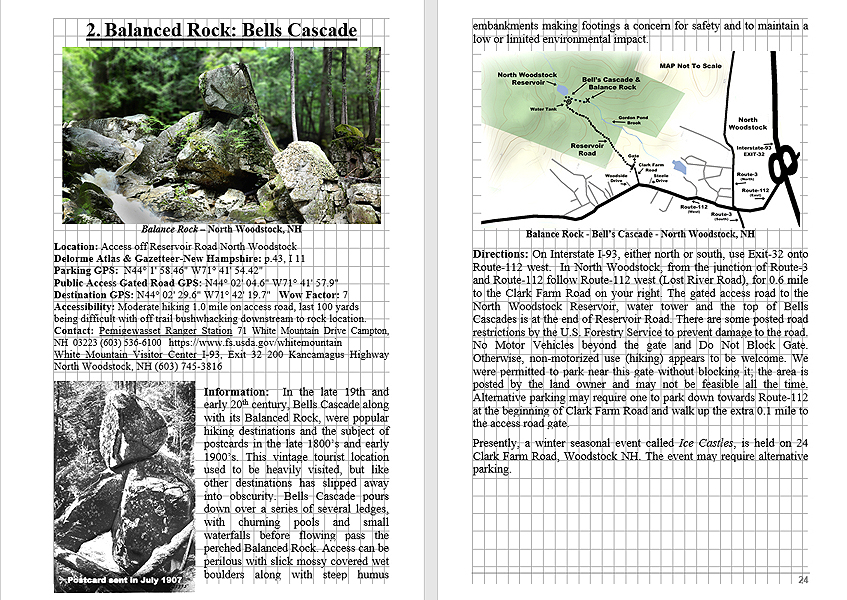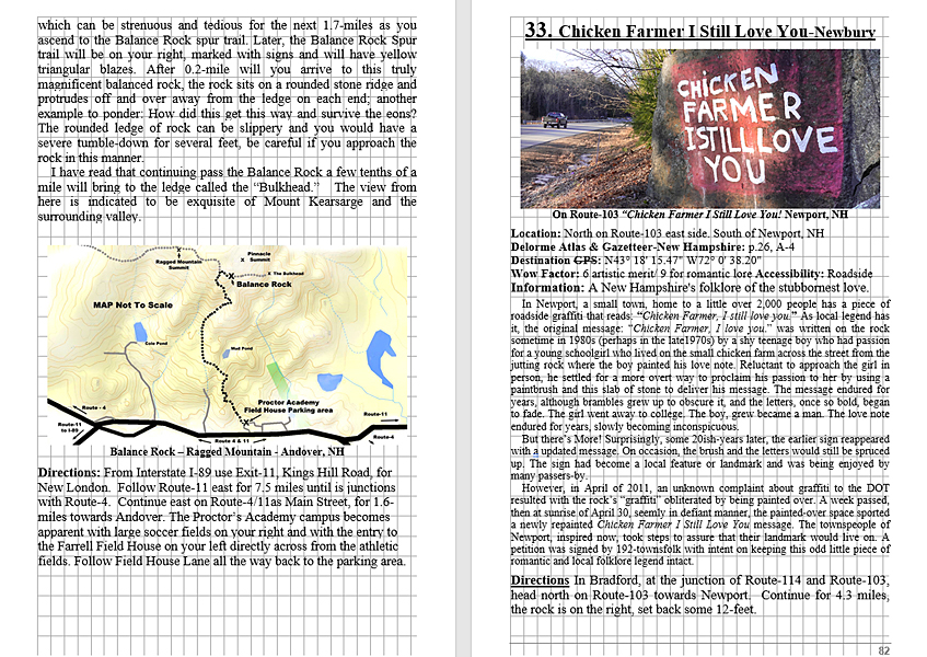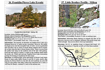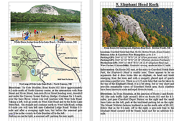 Look Inside The Book (Samples of various pages -click to enlarge) Table of Contents for New Hampshire Destinations Waterfalls - Boulders - Hikes - Points of Interest - Statues Total of 338 pages, 157+ Chapters, arranged alphabetically within each section. |