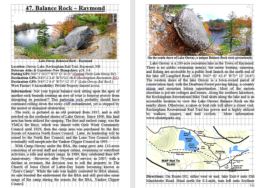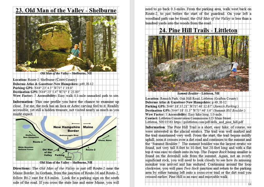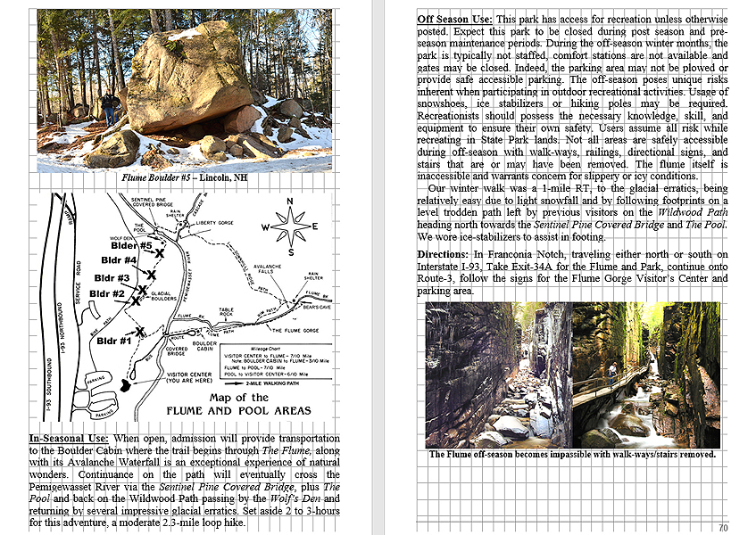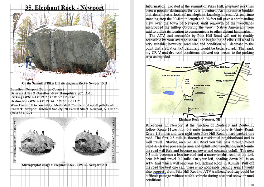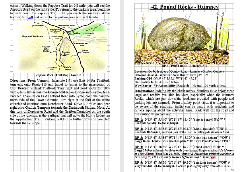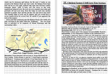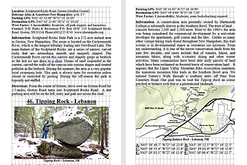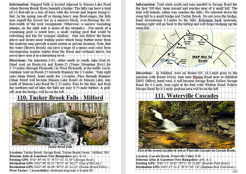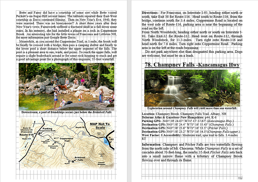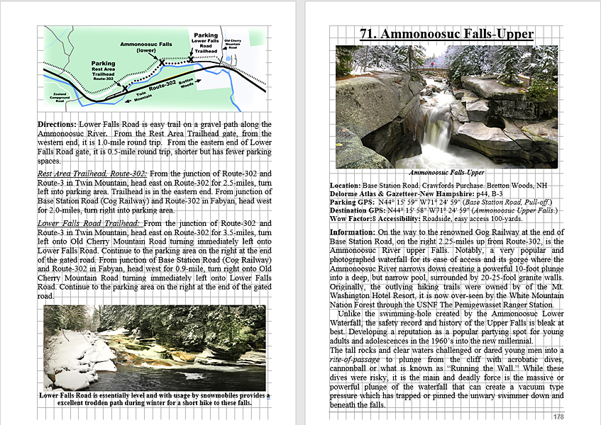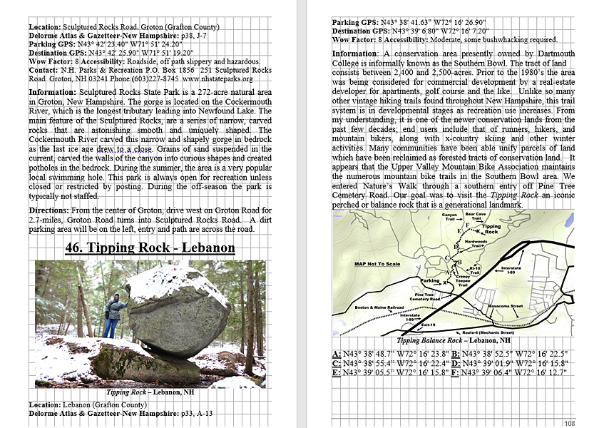 Look Inside The Book (Samples of various pages -click to enlarge) Table of Contents for New Hampshire Destinations Waterfalls - Boulders - Hikes - Points of Interest - Statues Total of 338 pages, 157+ Chapters, arranged alphabetically within each section. |