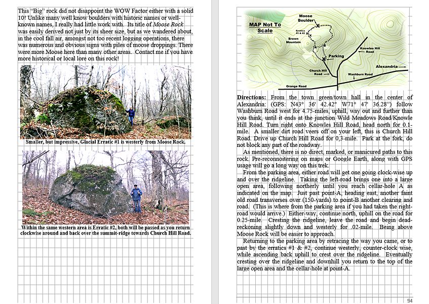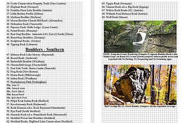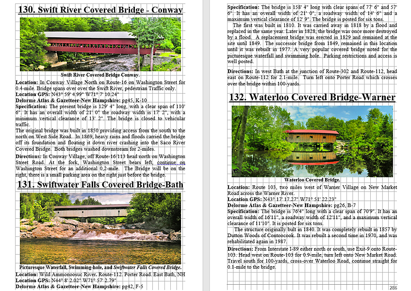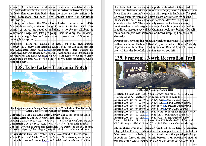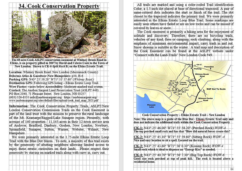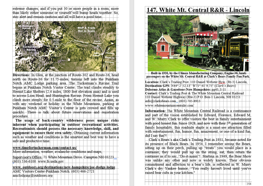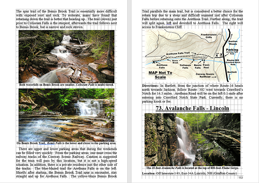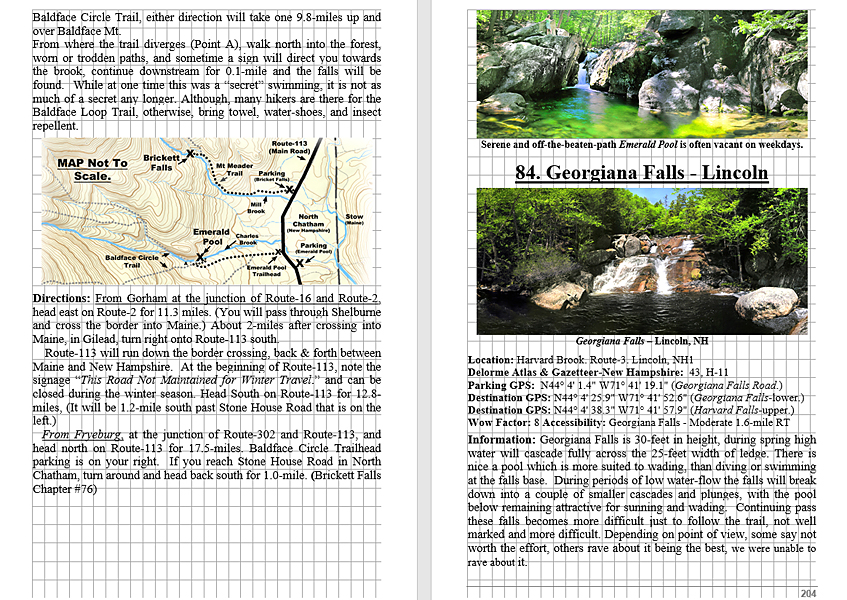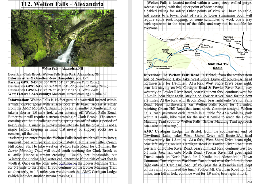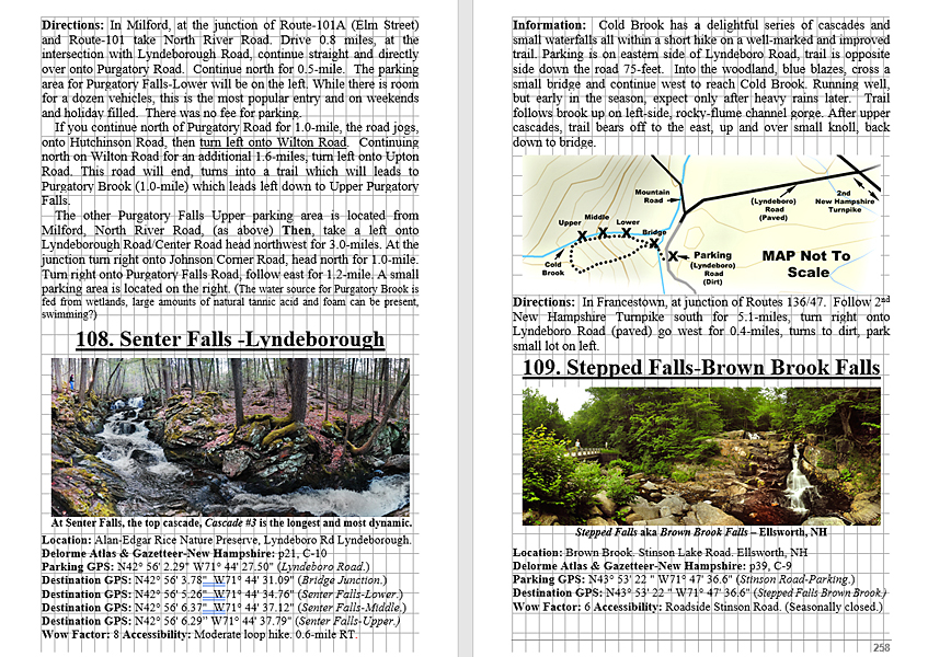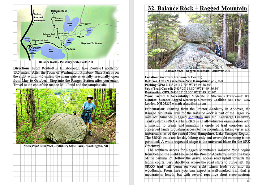Look Inside The Book (Samples of various pages -click to enlarge) Table of Contents for New Hampshire Destinations Waterfalls - Boulders - Hikes - Points of Interest - Statues Total of 338 pages, 157+ Chapters, arranged alphabetically within each section. |