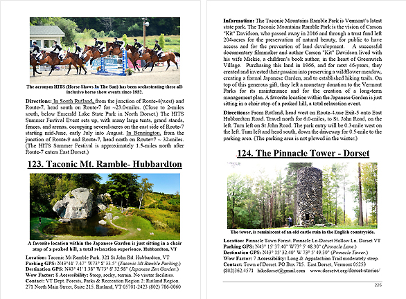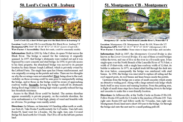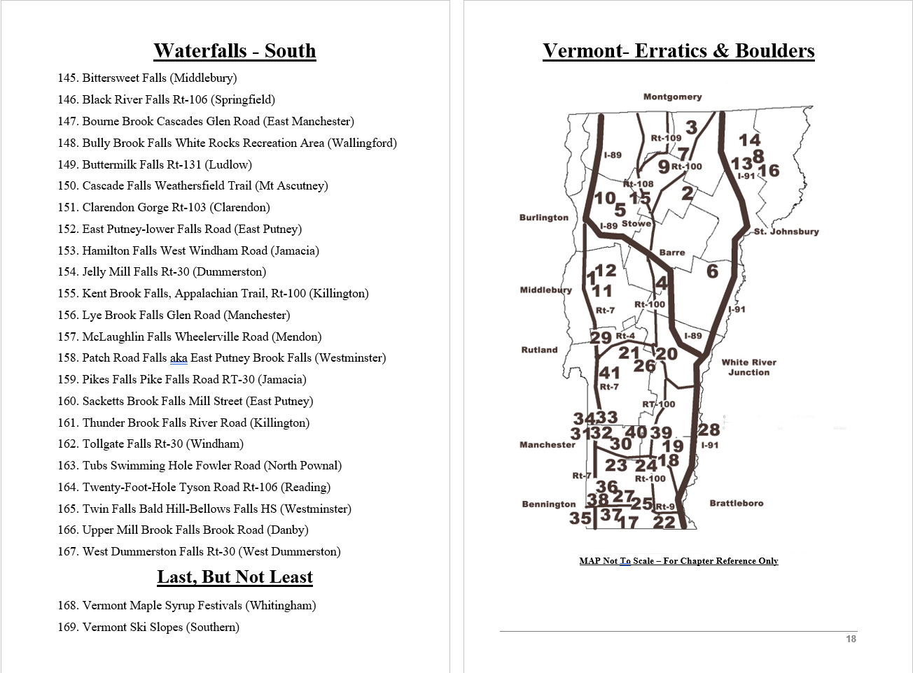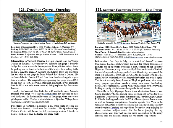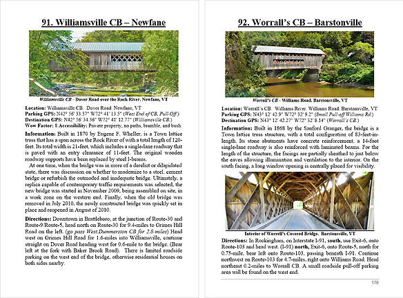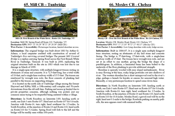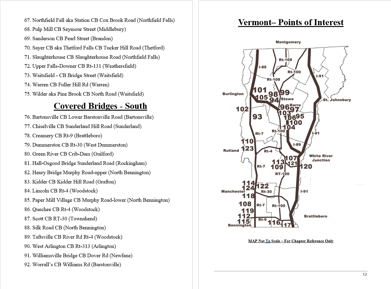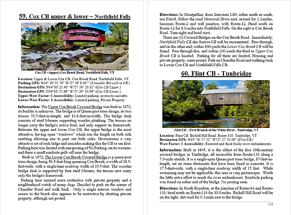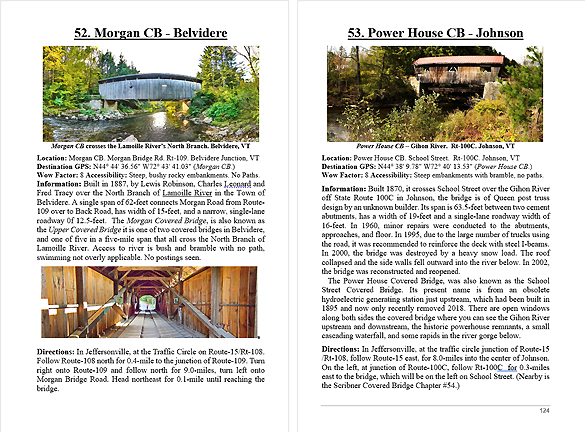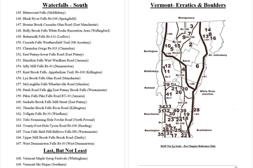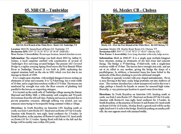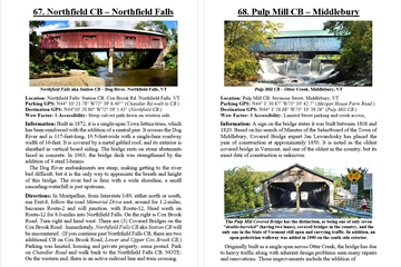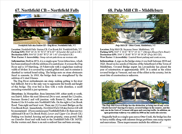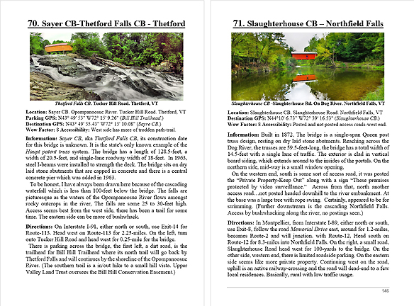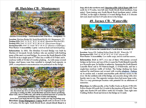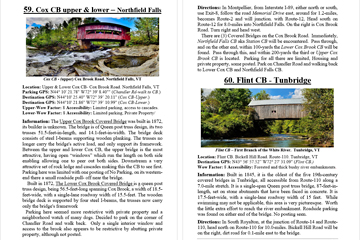 Look Inside The Book ( Random Samples of Various Pages) Covered Bridges -Waterfalls - Boulders - Points of Interest Total of 304 pages, 170 Chapters, arranged alphabetically within each section. |